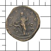 SALVS - AVG. Salus steht in der Vorderansicht, den Kopf nach l. Sie hält in der r. Hand eine Schale und füttert eine Schlange, welche sich um einen Altar windet. In der l. Hand hält sie ein Zepter. Beiderseits S - C. |